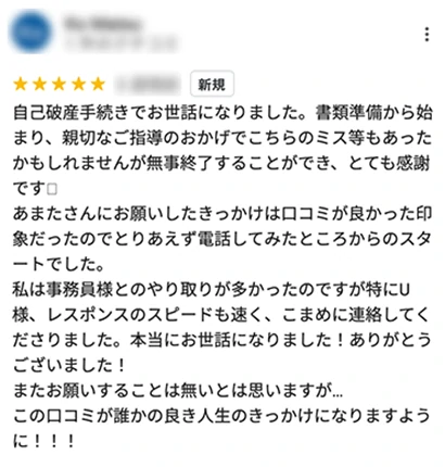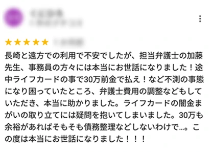 嫁にも相談し、すぐに手続にとりかかって頂きました。今では我が家に合ったペースで返済する事ができています。あのとき先生に相談していなかったらと思うと恐ろしいですが、相談を親身に聞いてもらえた先生には感謝しかありません。
